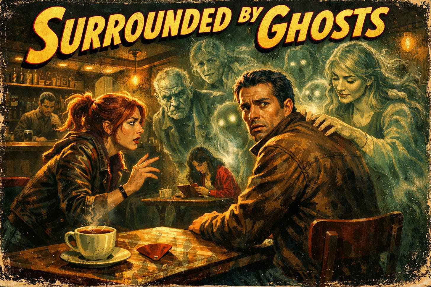 She smiled, but not in amusement. “You think this is a story? That I’m making this up.” I looked away. A man was sitting alone two tables down, staring into his phone, earbuds in. Mark, the barista, was wiping a counter again, for the third time in five minutes, either bored or politely pretending not to listen. The café had returned to its background hum—but not for me. “I didn’t come here for you,” Chris said. “I came for someone else. But your ghosts were louder.”