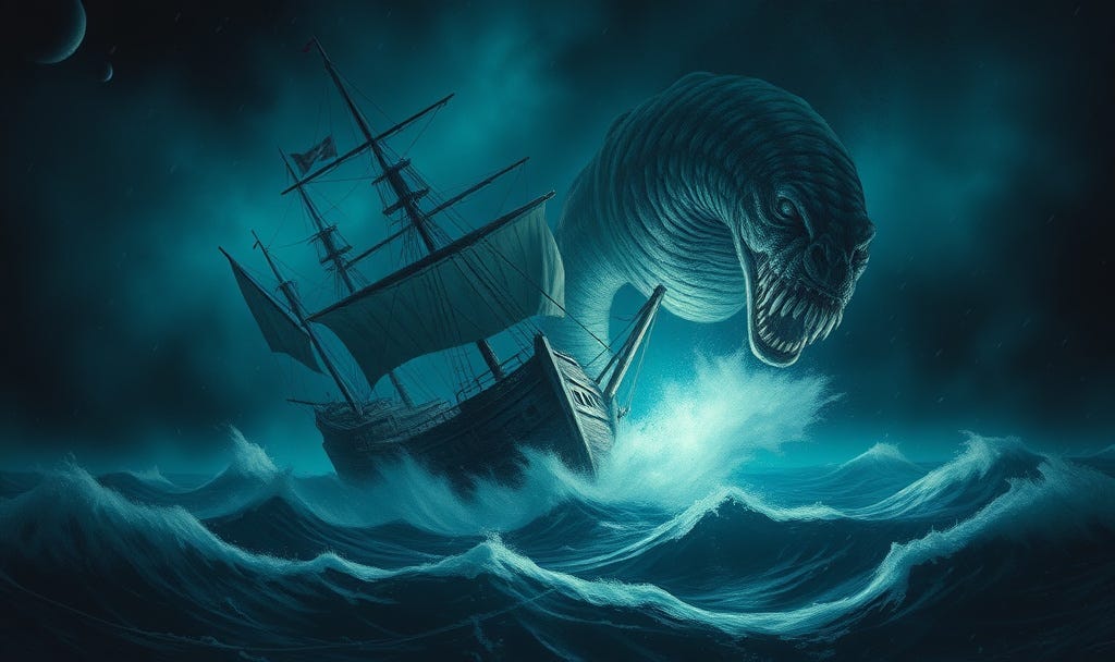 Others speak of tendrils, thin as anchor lines yet strong enough to drag a cutter sideways through a gale. But they all agree on one thing, it moves without sound. The creature rises as if displacing light rather than water. Shadows float before it. Then everything is swallowed.