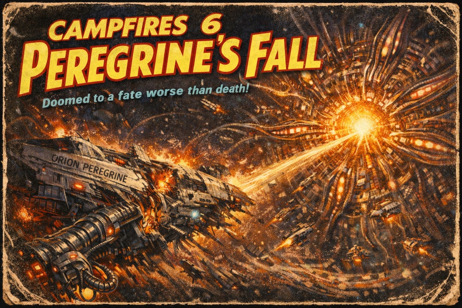 As Orion Peregrine breached the event horizon’s outer skin, the hull didn’t buckle. It became somewhat feeble and pliable. Phased by the sheer intensity of gravitational tides. Saelis looked out the room’s viewport she’d made her way to, and the ‘dark’ she expected to see was gone. Instead, she saw the great lurer, but it wasn’t a celestial phenomenon. It was a structure. A gargantuan, pulsating hub that wasn’t just a graveyard, it seemed to be something of a grand sphere.