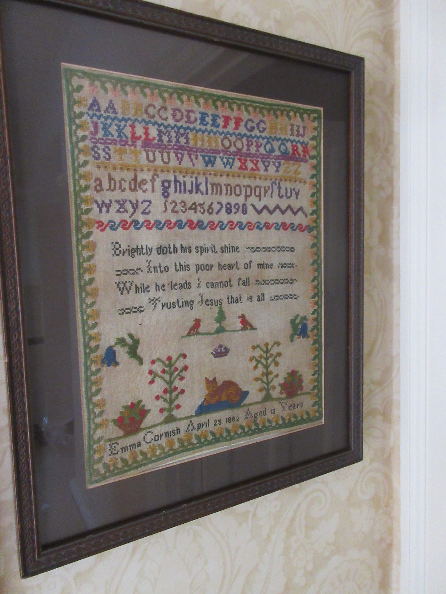 Probably this piece of cross stitch by Emma Cornish - a distant ancestor - dated 25th April, 1882. I might have some family bibles in the loft that are a bit older.